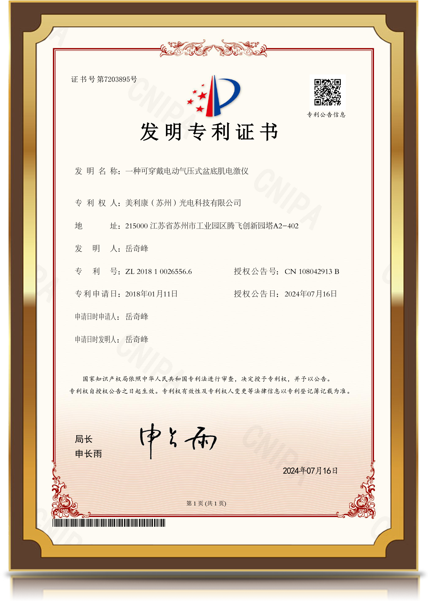 可穿戴电动气压式盆底肌电激仪专利证书...